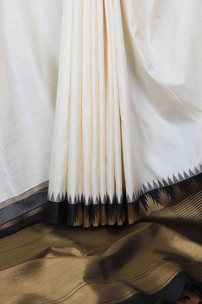 So when the ‘petni’, a structural necessity, interlocks the border and body, these triangles of a lighter, blended colour formed from threads of both sections, emerge adding a slightly rough texture to this portion. These tiny serrated triangles or multi-spiked articulations are a blend of divinity and design detail that have been the hallmark of Kanjeevaram sarees for centuries as weavers passed on looms to the next generation. Other features are a straight-line interlock to more elaborate temple inspired ‘gopuram’ forms.